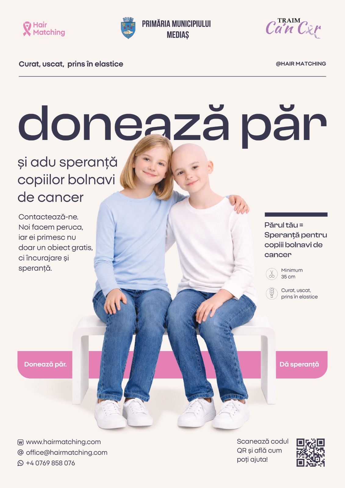 Tot în acest context, Fundația Hair Matching, în colaborare cu Primăria Municipiului Mediaș și Asociația Trăim Ca’n Cer, demarează o campanie de donații de păr, destinată realizării de peruci din păr natural pentru persoanele care suferă de afecțiuni oncologice.