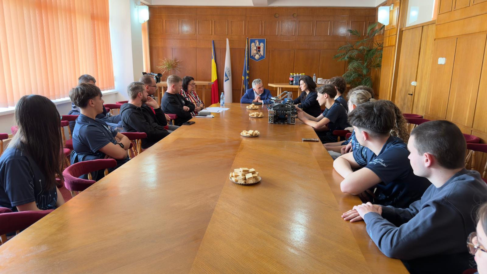 În data de 15 aprilie 2026, la sediul Primăriei a avut loc o întâlnire între primarul municipiului Mediaș, domnul Gheorghe Roman, echipa de robotică „The Resistance” a Liceului Teoretic „Roth-Oberth”, directorul liceului, doamna Aura-Viviana Pântea și reprezentanții cafenelelor The Bean Roasters și Coffee CooP.