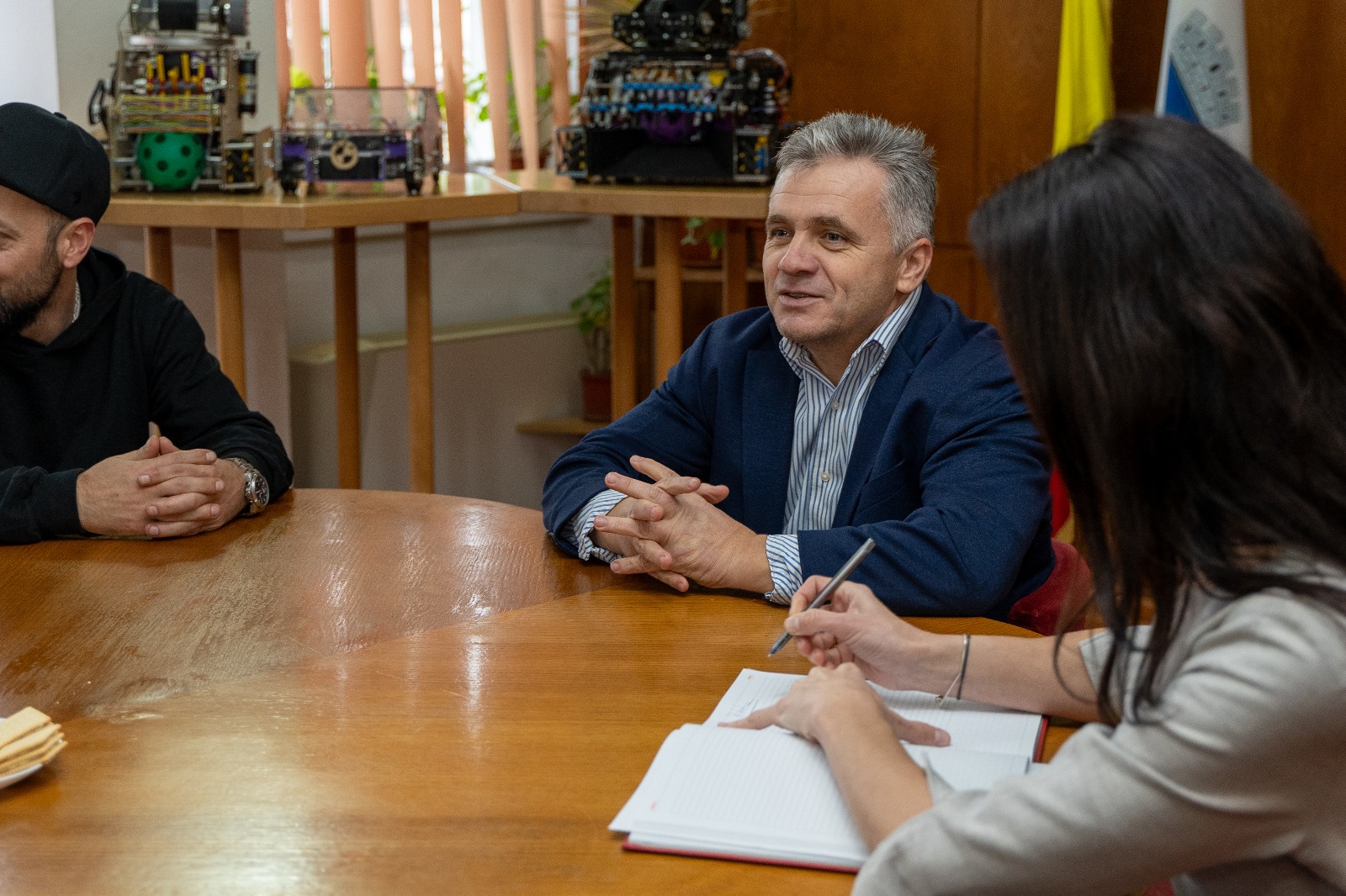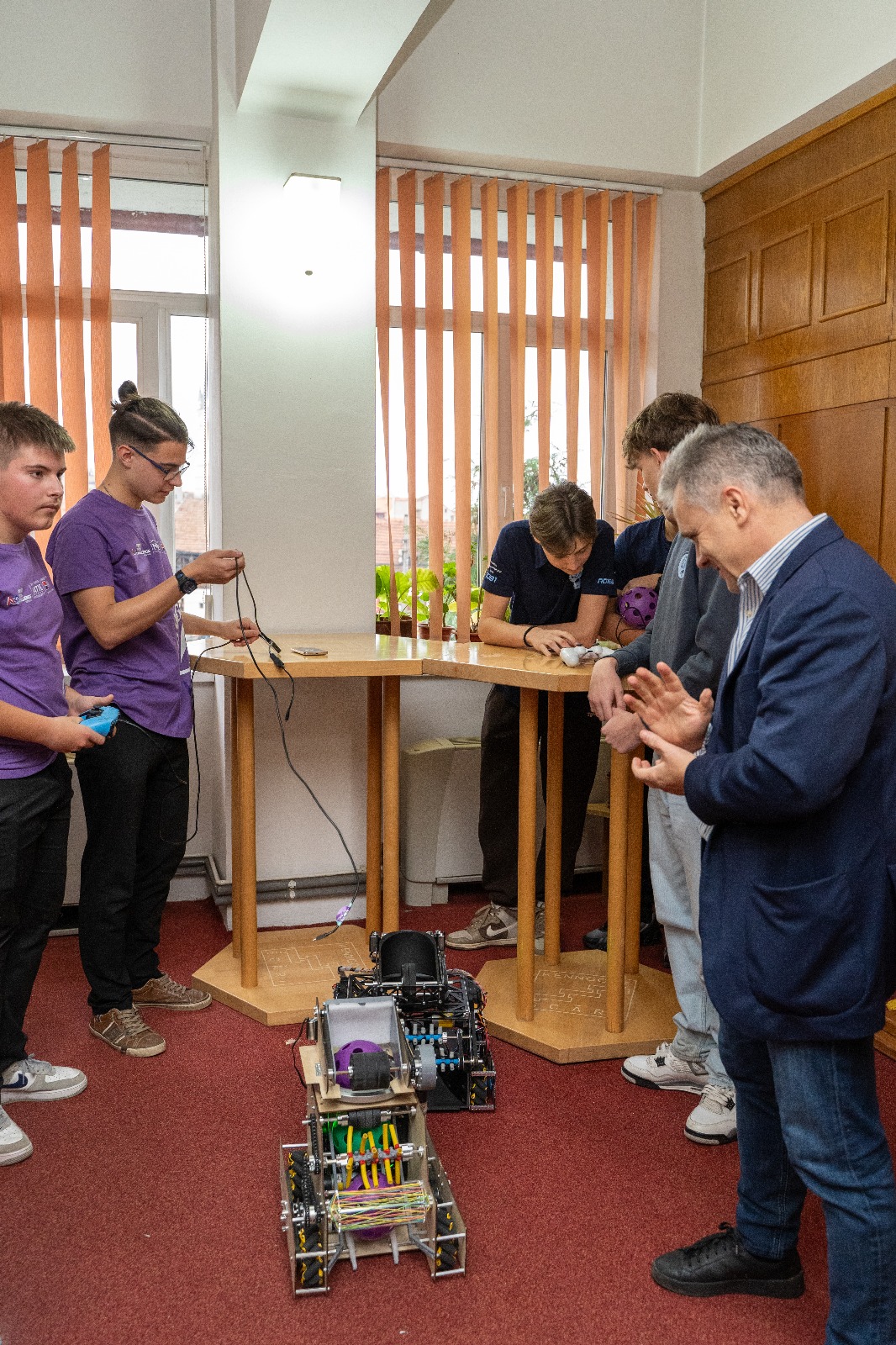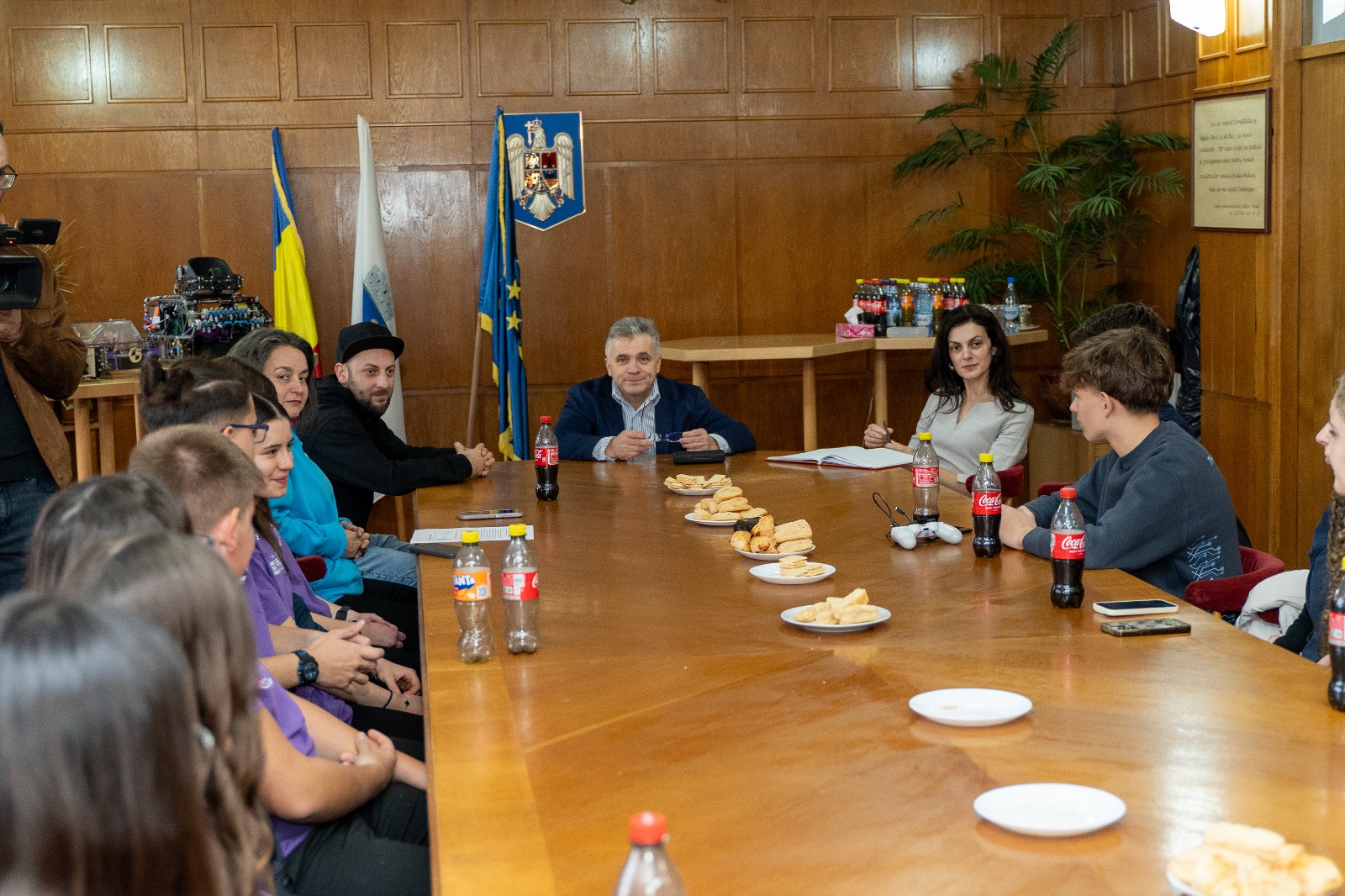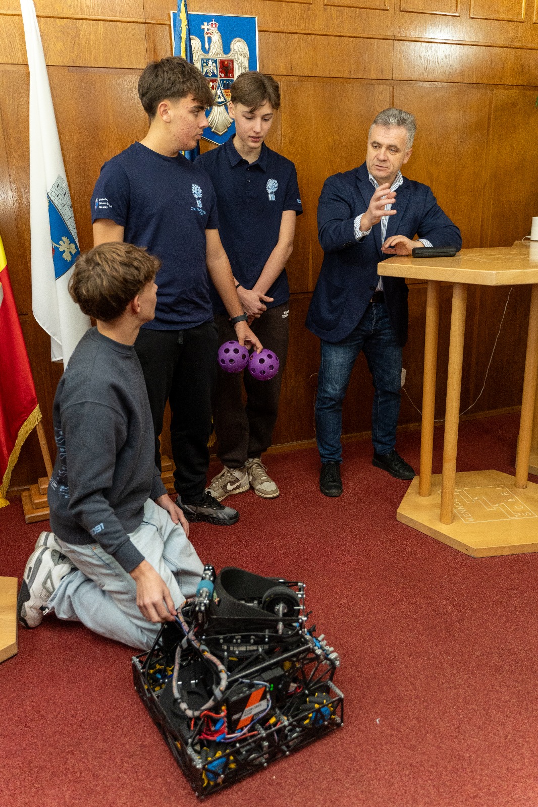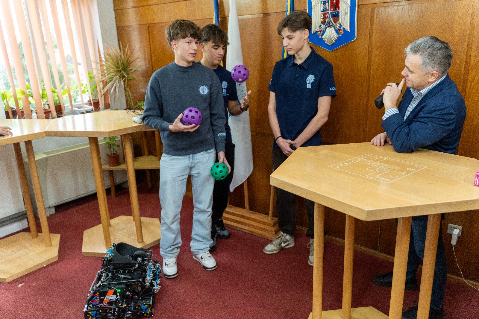 Primarul municipiului Mediaș, domnul Gheorghe Roman, a avut o întâlnire cu membrii celor două echipe, însoțiți de profesorii coordonatori domnul Alex Musteață și doamna Cornelia Maier, care s-a desfășurat astăzi, 27 noiembrie, la sediul Primăriei, pentru a discuta aspectele legate de colaborarea cu administrația publică locală pentru a facilita deplasările la meeting-urile competiției FIRST Tech Challenge, dar și la competiția regională de robotică.