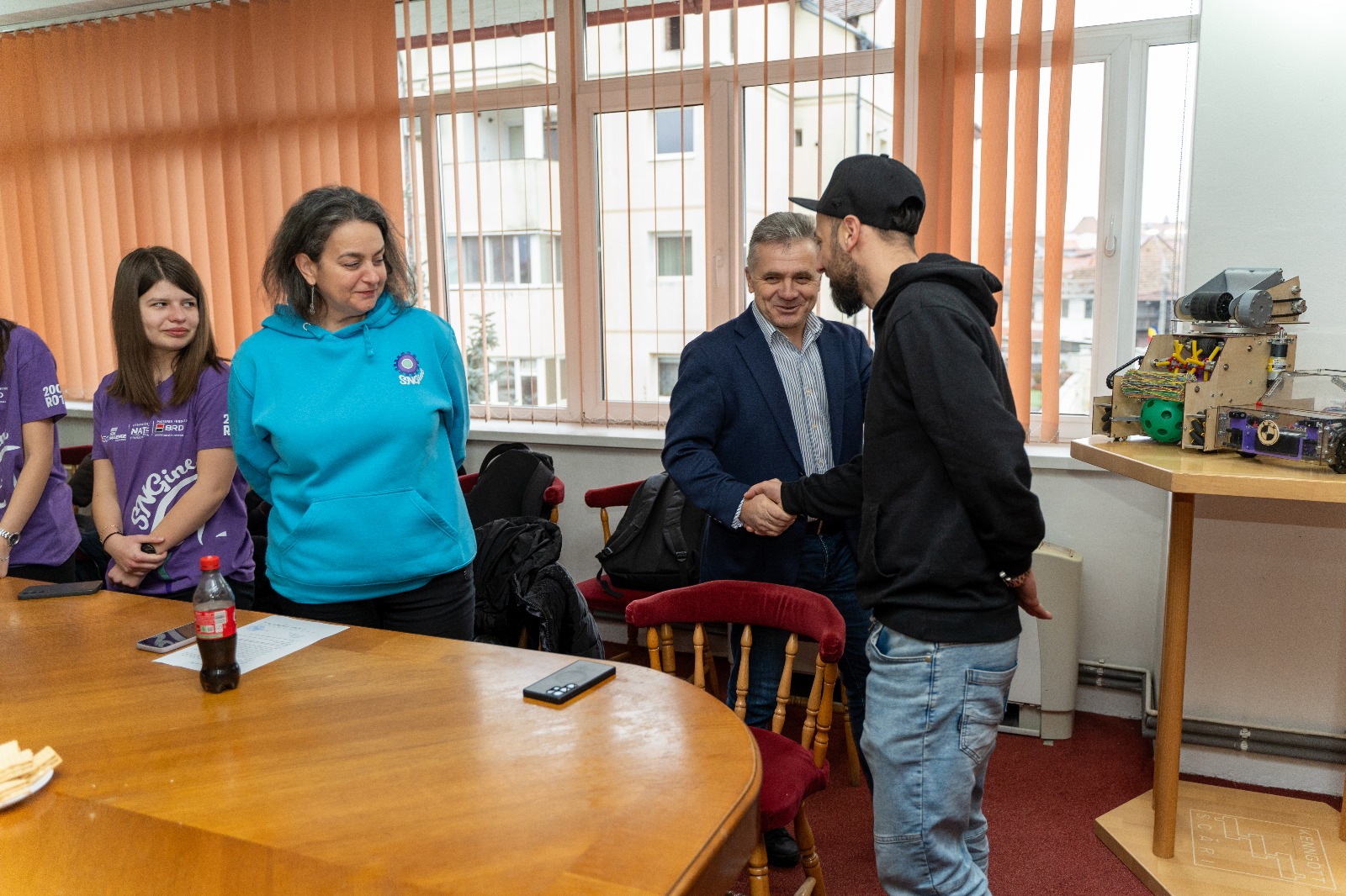Primarul municipiului Mediaș, domnul Gheorghe Roman, a avut o întâlnire cu membrii celor două echipe, însoțiți de profesorii coordonatori domnul Alex Musteață și doamna Cornelia Maier, care s-a desfășurat astăzi, 27 noiembrie, la sediul Primăriei, pentru a discuta aspectele legate de colaborarea cu administrația publică locală pentru a facilita deplasările la meeting-urile competiției FIRST Tech Challenge, dar și la competiția regională de robotică.